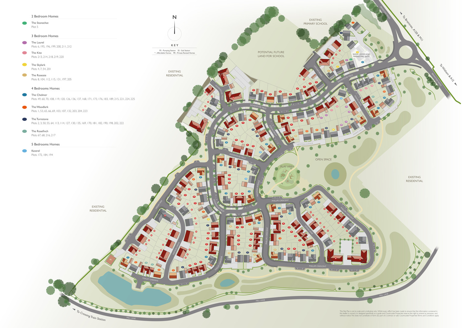 The site plan which can be found on this page, has been produced for home identification purposes only and is not to scale. The development layout, landscaping and tenure of all dwellings may be subject to change throughout the course of the development. Finishes and materials may vary from those shown on the plan. Please check the details of your chosen plot and house type with the sales consultant. Development layout plan correct at time of production.