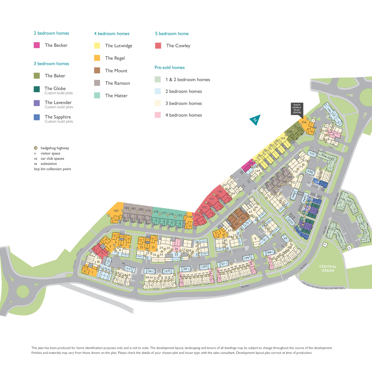 The site plan which can be found on this page, has been produced for home identification purposes only and is not to scale. The development layout, landscaping and tenure of all dwellings may be subject to change throughout the course of the development. Finishes and materials may vary from those shown on the plan. Please check the details of your chosen plot and house type with the sales consultant. Development layout plan correct at time of production.